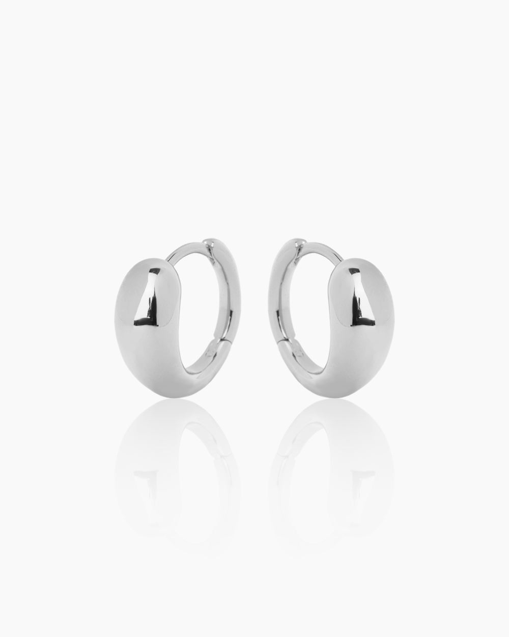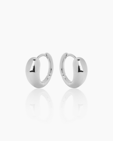 The Nora Silver Huggies feature a distinct teardrop-inspired fluid shape with a slightly more rounded profile. These bold, smooth huggies provide a comfortable fit and a substantial, chic statement.
