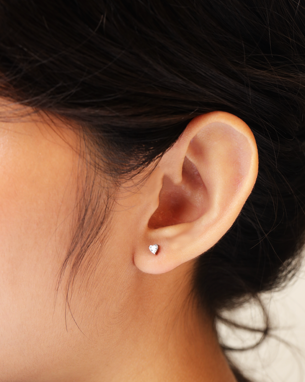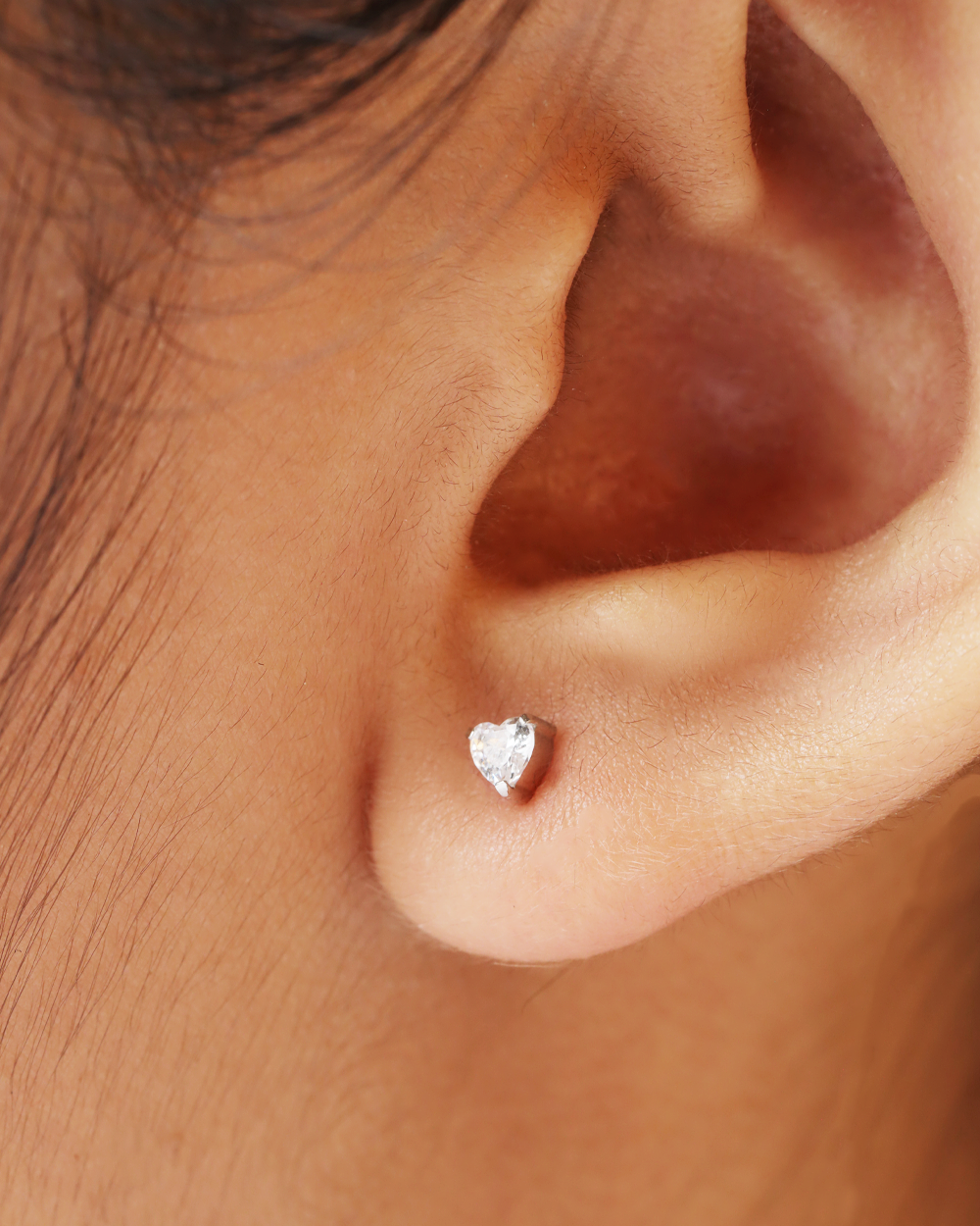 The Nic Flatback Studs feature a dazzling heart-shaped cubic zirconia stone, secured with a comfortable flatback post. This romantic and eye-catching stud is perfect for expressing a little love and is comfortable for all-day wear in any piercing. Available in both gold and silver finishes.