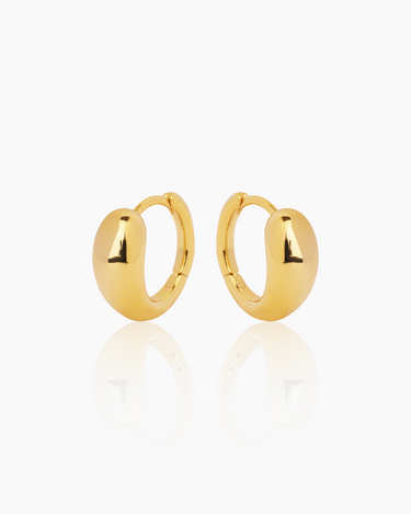 The Nora Gold Huggies feature a distinct teardrop-inspired fluid shape with a slightly more rounded profile. These bold, smooth huggies provide a comfortable fit and a substantial, chic statement.