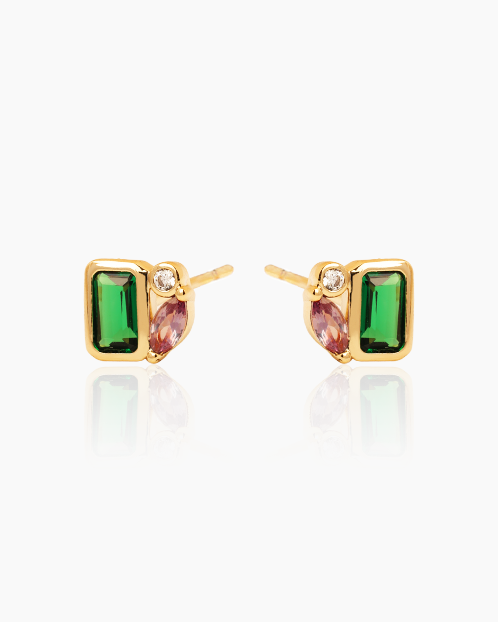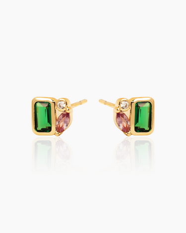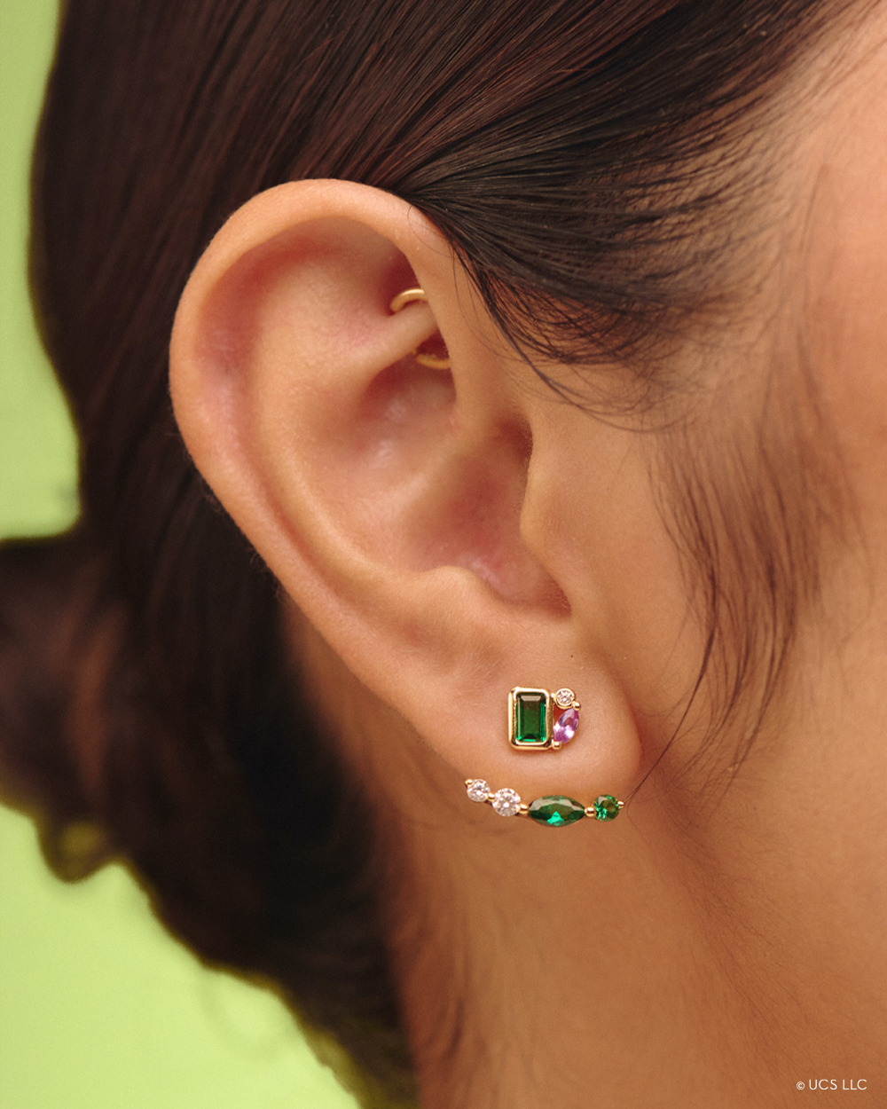 A dazzling fusion of Oz's dual powers. These gold studs bring together the vibrant green of Elphaba's magic with Glinda's radiant sparkle using an emerald-cut green cubic zirconia, round clear cubic zirconia and marquise purple cubic zirconia. A truly iconic piece that lets you wear both sides of the story with brilliant glamour.