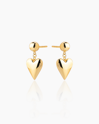 The Juno Gold Studs are a captivating pair of drop stud earrings featuring a dangling heart-shaped design. These elegant studs add a touch of glamour to any look.