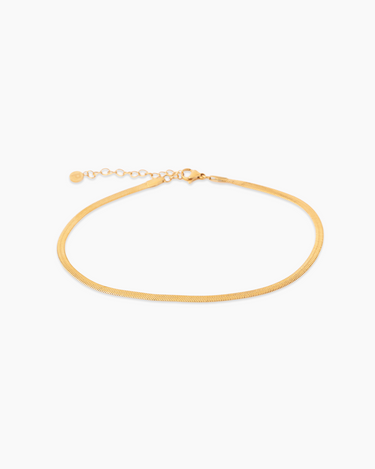 The Jaden Gold Anklet features a sleek, flat snake-style stainless steel chain, 14K IP gold plated for a luxurious finish. This anklet offers a subtle touch of elegance.