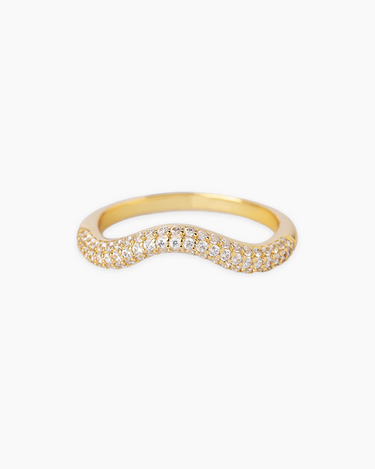 The Leona Gold Ring is a statement-making gold band ring with a curved pavé design. A luxurious and eye-catching piece, this ring is set to elevate any outfit.