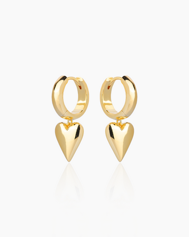 The Lovina Gold Huggies are a stylish and modern pair of earrings featuring a heart-shaped charm. The comfortable huggie design and delicate details make them a perfect everyday accessory.