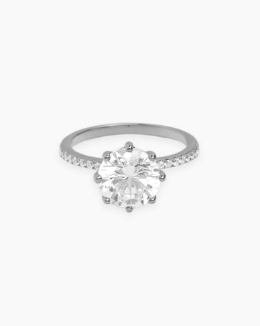 Be the center of attention with the Margaret Silver Ring. Designed with a large round-cut crystal on a pavé halo, this elegant piece shines just like a diamond ring at a fraction of the price.
