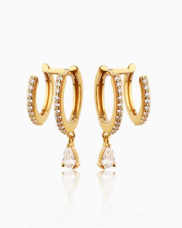 If dainty elegance were an earring, it would be the Tina Gold Huggies. A double pavé design with adorned with a dangling teardrop crystal, it’s just what you needed for adding a touch of sparkle to your everyday.