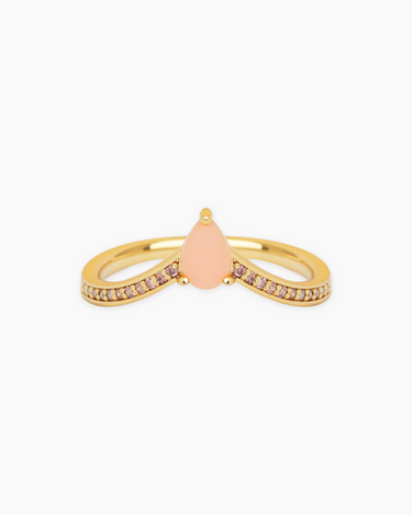 Own your moment to shine. Inspired by Glinda's most famous moment, this statement ring features a large, luminous natural pink stone set in a gold band paved with vibrant pink accents. A piece of classic, colorful glamour.